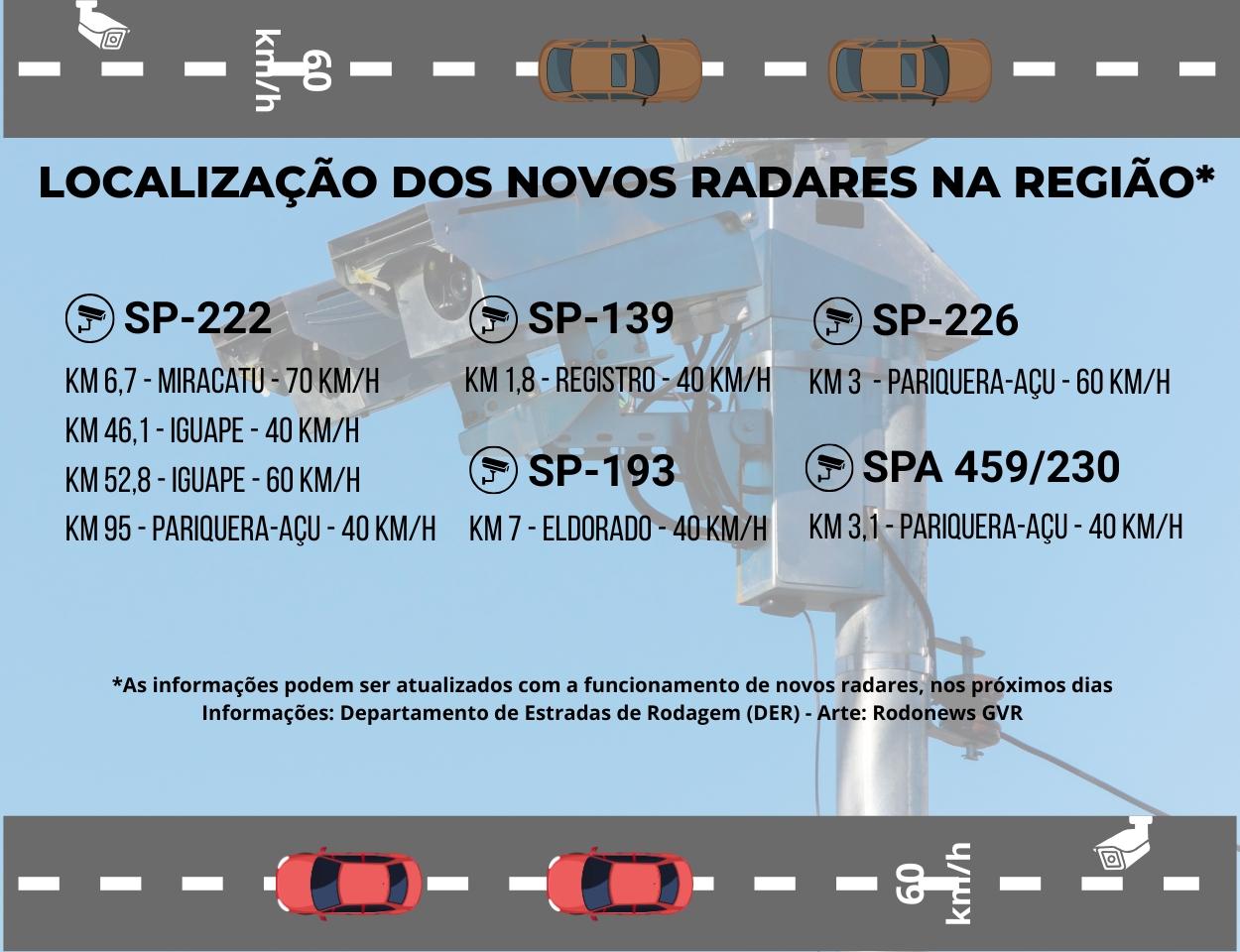 A Rodovia Prefeito Casemiro Teixeira (SP-222) já contava com novos dispositivos em Miracatu (km 6,7), em Iguape (km 52,8) e em Pariquera-Açu (km 95). Completam a lista anterior um radar na Rodovia Abílio Previdi (SP-226), em Pariquera-Açu (km 3), e outro na Rodovia SP-193, em Eldorado (km 7).